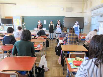 11/2(水)教養委員会主催による家庭教育学級「給食試食会」が行われました。この企画は,コロナ禍により3年ぶりの実施となりました。今回約80名の保護者の皆様にご参加いただきました。当日の献立は,『ごはん・牛乳・さんまの蒲焼き・おひたし・さつま汁』です。給食を召し上がっていただくのは,とても貴重な機会だと思います。地産地消の手作りの給食を味わっていただき,とてもおいしかったという感想をいただきました。