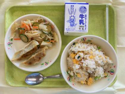 今日の給食のぎょうざには、茨城県産のほうれんそうが入っています。青菜チャーハンには、JAから納入された小松菜が入っています。どちらも鉄分やカルシウムが豊富に含まれており、それぞれ違う栄養素も入っていますので、どちらも食べて、元気な体を作っていきましょう。