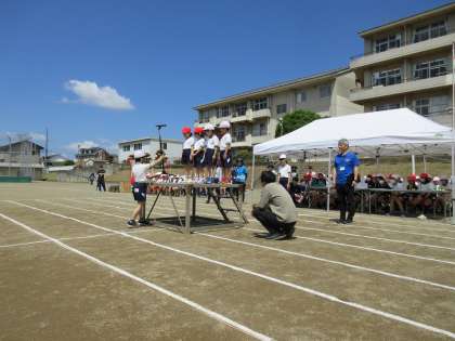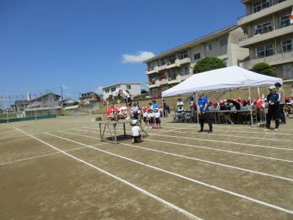 5月16日(火)、運動会の予行練習を行いました。朝から全員がやる気満々です。開会式では、6年生の代表児童が今年のスローガン「「友との絆を信じ合い勝利の道へとつき進め」を発表した後、1年生の代表児童4名が大きな声で元気よく開会宣言を行いました。