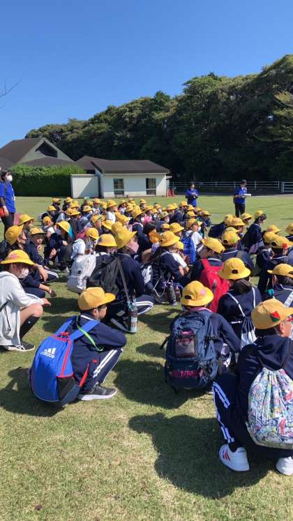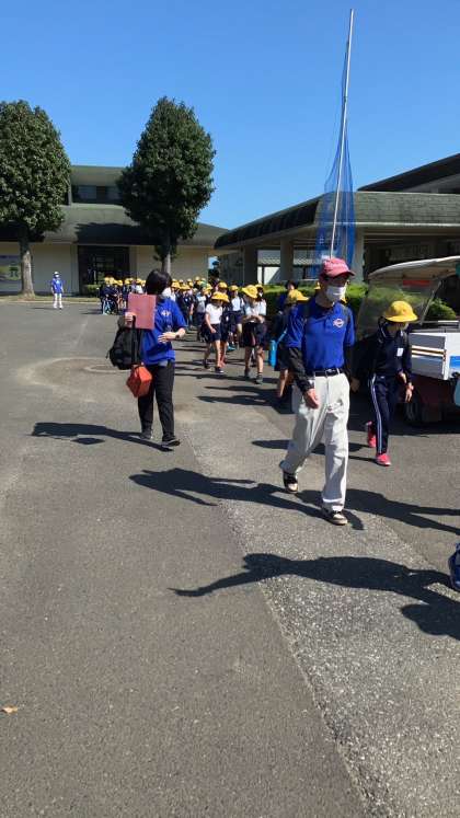 入所式後に施設内を確認し、次は外にある施設を見学します。ウォークラリーやキャンプファイアの場所がどこにあるかを迷わないようにするためです。そろそろお腹がすいてきたようですので、まもなく昼食となります。