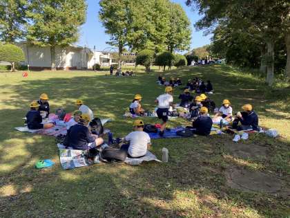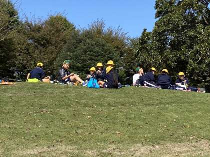 各施設の確認が終わったので、お腹がすきました。グループに分かれてお弁当を食べました。雲一つない青空の下、みんなで食べるお弁当はよりおいしく感じました。保護者の皆様には、早朝より宿泊の準備はもちろんのこと、お弁当まで作っていただき、ありがとうございました。少し休憩をしたら、ウォークラリーが始まります。