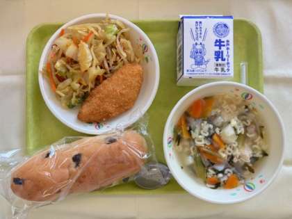 レーズンが苦手な児童がいるようで、今日はパンの残りが少し多く感じました。レーズンには、鉄やカリウムなどが多く含まれています。食物繊維も豊富なので、ぜひ挑戦してみてほしい食品です。