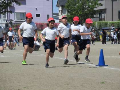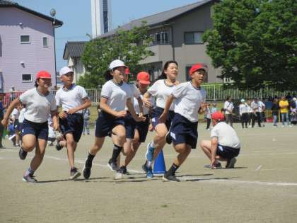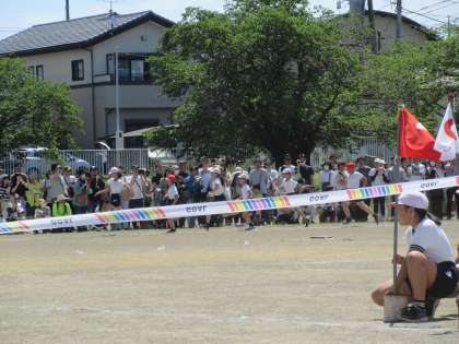 6年生の個人種目【勝利をつかめ!ドラゴン ダッシュ!】です。運動会の予行練習では全員が走っていませんでしたので、どの組も必死に勝利をつかもうと走っている姿がとても印象に残りました。