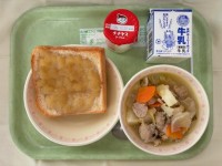 今日の給食 コーンツナマヨネーズトースト 牛乳 肉団子と野菜のスープ煮 プリン
