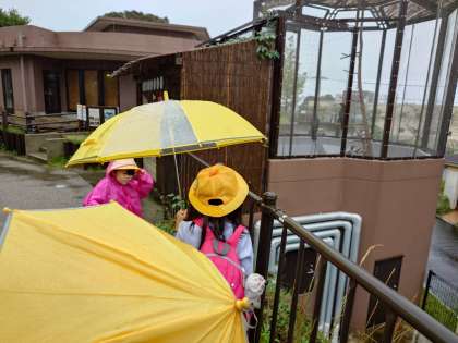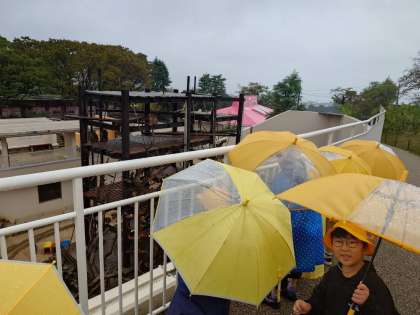 雨は降り続いていますが、児童は班ごとにたくさんの動物を見て楽しく見学しています。