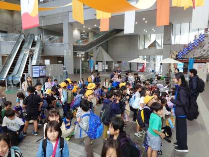 2年生は日立シビックセンターに到着しました。集合写真を撮ってからお弁当の時間になります。
