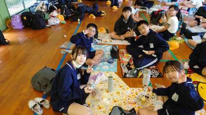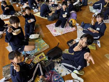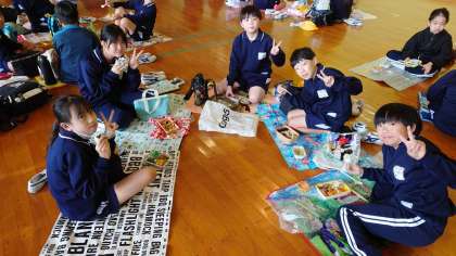 5年生もお弁当の時間です。体育館で食べました。午後は小雨が降っているのですが、ウォークラリーを行う予定で準備をしています。