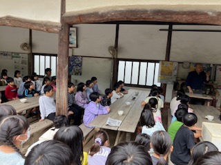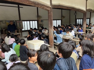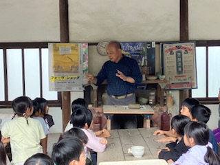 初めて焼き物を作る児童が多いので、真剣に聞いています。どんなものを作ろうかなと考えているようですね。