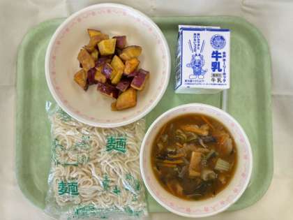 今日の給食 カレー南蛮うどん 牛乳 大学いも