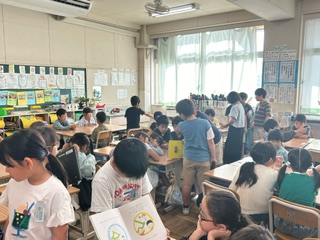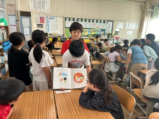 1年生の教室に行ってみると、3年生が1年生に読み聞かせをしていました。国語の授業で、気に入った本を紹介する学習だそうです。気に入ったお話だけあり、読むのがとても上手です。1年生は、3年生のお兄さん、お姉さんの読み聞かせを真剣に、ときには笑顔で聞いていました。