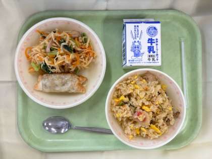 今日の給食 五目チャーハン 牛乳 棒ぎょうざ 切干大根のサラダ