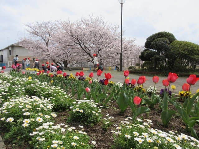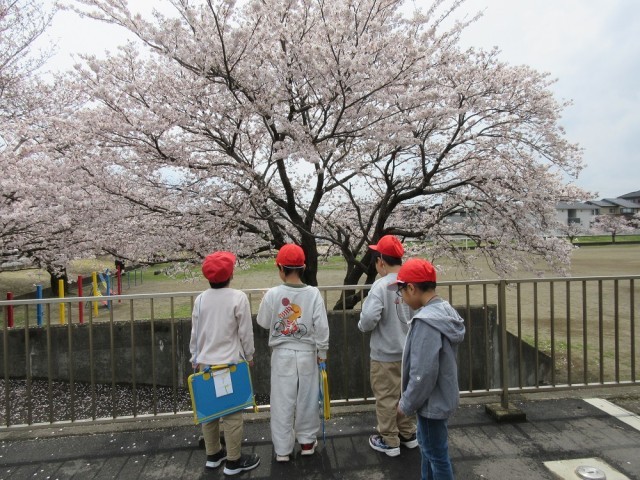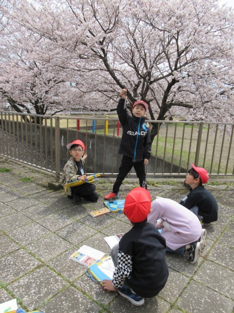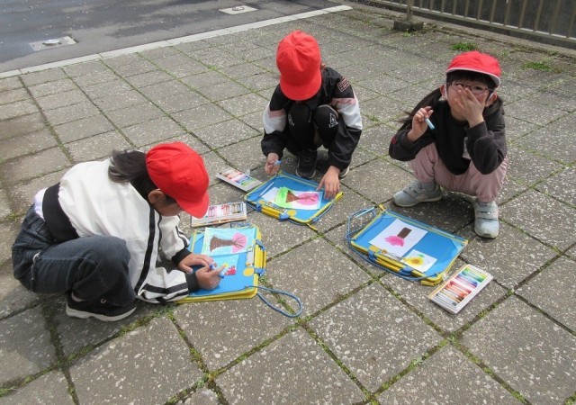 1年生が下校する頃、2年生がたんけんバッグを持って、外に出てきました。何をするのか聞くと、「図工で春の絵を描くんだよ」と教えてくれました。みんな桜の木に向かっています。校庭の桜はちょうど満開を迎え、風が吹くと花びらが散ってとてもきれいです。「わあ、雪みたい」「きれーい」などと話しながら、花びらの吹雪も描いている子もいました。1年生教室前の花壇には、チューリップやパンジーも咲いています。「私は、赤いチューリップが好き」「ウグイスみたいな鳥が飛んでいたよ」「この白い花、おもしろい形しているよ」などとたくさんの春を見つけ、楽しく絵を描いていました。