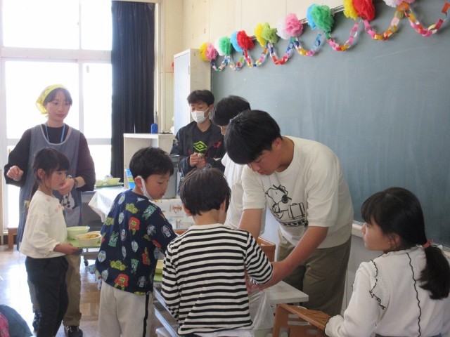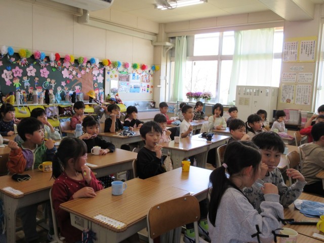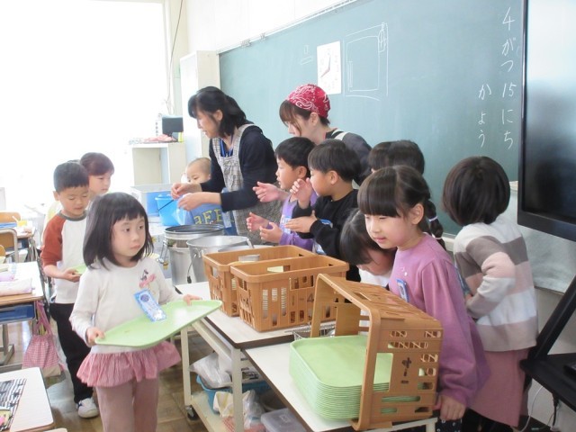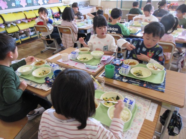 1年生は、今日から給食が始まりました。今日の献立は、「ごはん、牛乳、チキンカレー、海藻サラダ」です。給食当番の子たちは白衣を着て、おかずを配ったり、おぼんにおかずをのせて、みんなのところまで届けたりしました。待っている子も「早く食べたい」とわくわくしながらも、しっかり待てました。「いただきます」のあいさつのあとは、もぐもぐタイム。「学校のカレーってどうしてこんなにおいしいの?」「あんまりからくなかったよ」「全部食べられたよ」などとお話していました。片付けの時には、6年生が手伝いにきてくれました。さすが、6年生。すばやく片付けをしてくれました。食後の歯みがきもして、給食の流れが分かりました。明日からの給食もお楽しみに。