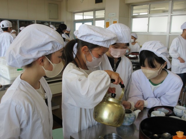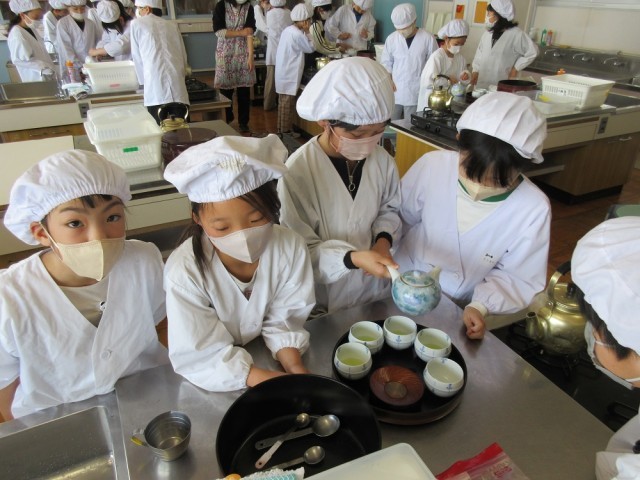 5年生が家庭科室で「お茶の入れ方」の学習をしました。やかんでお湯を沸かして、茶葉を急須に入れて、お湯を注ぎます。みんな慎重に注いでいました。自分たちで淹れたお茶はおいしかったことでしょう。お家でも、ぜひ家族のみんなに淹れてあげてくださいね。