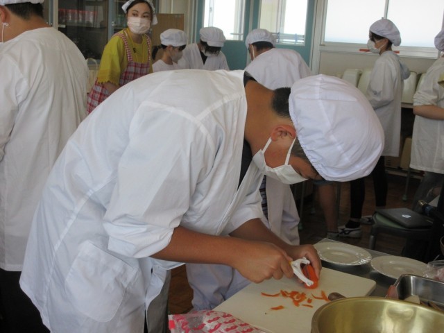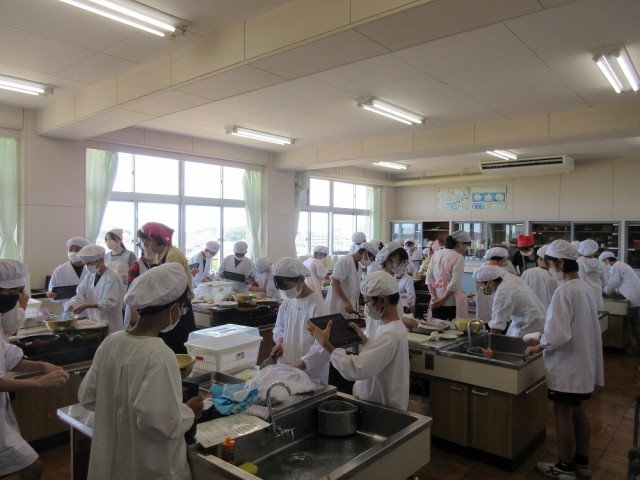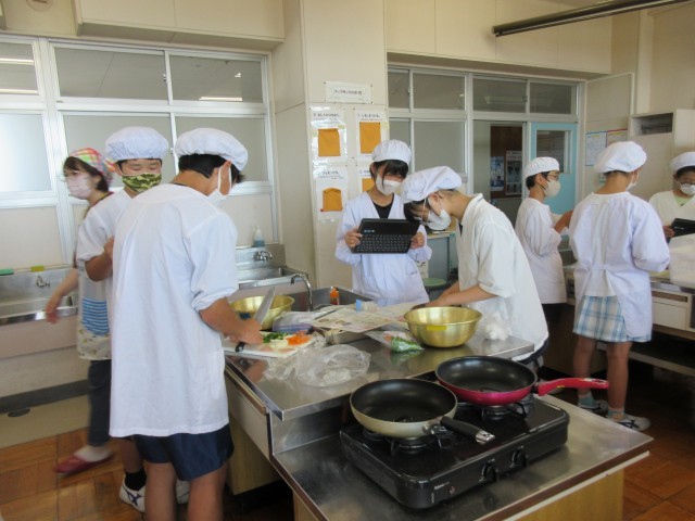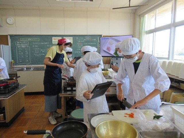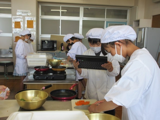 6年生が楽しみにしている調理実習。今回は「いろどりいため」を作りました。今回、安全のためにたくさんのボランティアさんがお手伝いにきてくれ、包丁などの使い方を教えてくれました。みんな緊張しながら、ピーラーでにんじんの皮をむいたり、包丁で短冊切りや細切りにしたり、フライパンでいためたりしました。「指を切らないように丸めて」「わーこわい」などと言いながらもがんばっていました。切っている姿をタブレットで撮影して、上手に包丁を使えているかチェックしもしているようです。最終的に味付けもして、自分で作ったいろどりいためをおいしくいただきました。これからどんどん包丁に慣れて、いろいろな料理が作れるようになるといいですね。ボランティアさん、ありがとうございました。