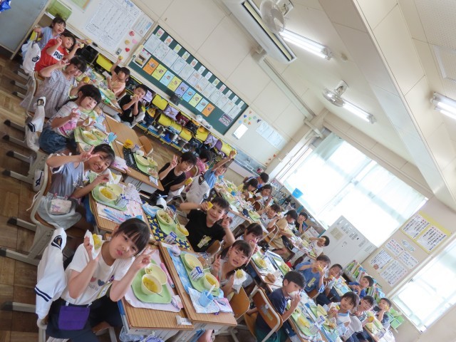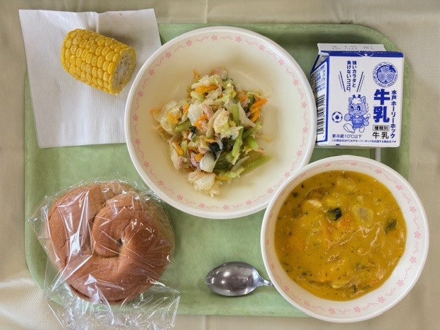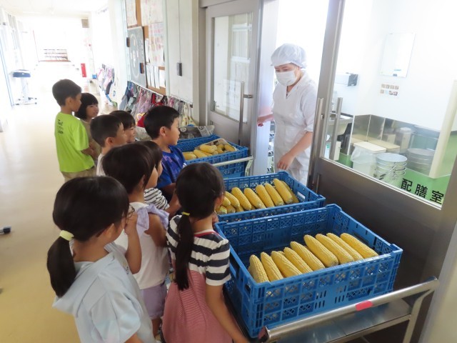 給食室では、きれいに洗って、3等分に切り、蒸し調理をして提供しています。今日は、虫食いや不揃いなどがほとんど無かったので、各学級におまけのとうもろこしがつきました。