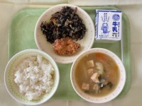 今日の給食ごはん牛乳鶏肉のからあげひじきの炒め煮じゃがいものみそ汁
