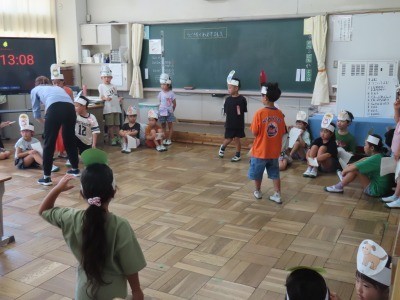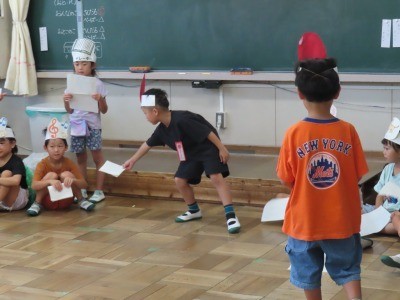 1年生が、国語の学習で「大きなかぶ」の音読劇の練習をしていました。役割を決めて、「動きをつけて読もう」という授業でした。