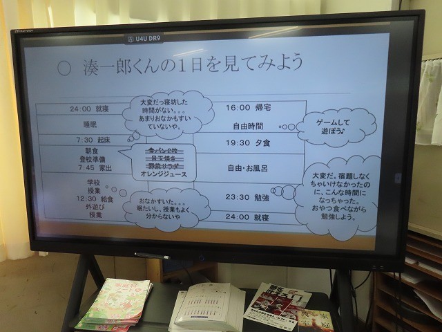 本日の3・4時間目に那珂湊第三小学校から栄養教諭の先生をお招きし、食育の授業がありました。「朝食の大切さ」について考え、朝食には3つのスイッチを入れる役割があることを教えていただきました。明日からの3連休では、各自が朝食について立てた目標を実践することになっています。今日学んだことを忘れずに、今後も朝食を大切に生活していきましょう。