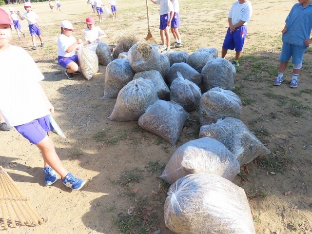 めっきり秋が深まってきた今日、グラウンドの落ち葉集めを4年生全体で行いました。日に日に舞い散る落ち葉と、刈り取りをしていただいた草を4年生全員で全力で集めました。少しでも学校のためにという気持ちで頑張っていた子どもたちの姿は、秋の優しい日差しを受けて輝いていました。