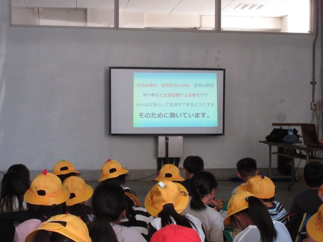 今日は、神敷台消防署の方々にご協力いただき、消防士さんのお仕事や、使っている車両について実物を見ながら勉強することができました。