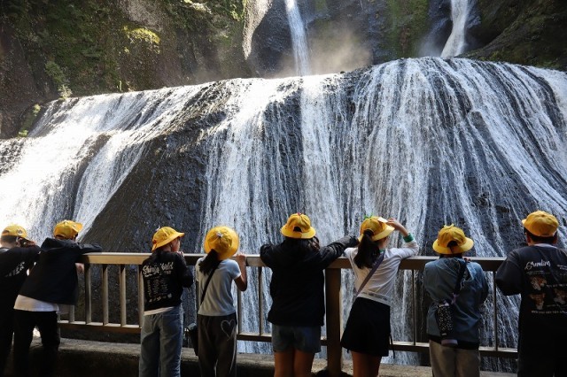 出発式の後バスに乗車し、一路袋田の滝に向かいました。今回はバスレクがたくさん行われ、楽しい気分のまま袋田の滝へ到着しました。屋内外の観瀑台で記念写真を撮りました。ここ数日の雨で、滝から流れ落ちる水量が復活したそうで、雄大な滝に息をのんだ子どもたちでした。