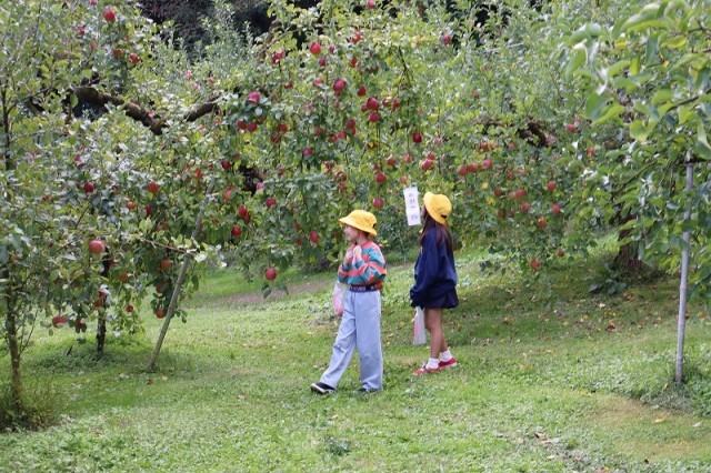 その後、藤田観光りんご園さんでお弁当を食べ、りんご狩りをさせていただきました。50種類以上のりんごがたわわに実っていて、子どもたちはどのりんごにしようか目移りしていていました。