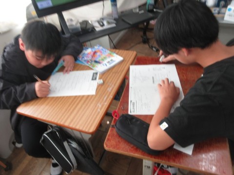 「答えだけ教えても意味がない」「自分で問題を解くより教える方が難しい」と言いながら級友と協力し、場合の数の学習に取り組んでいます。