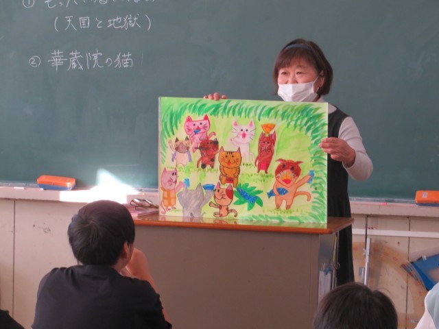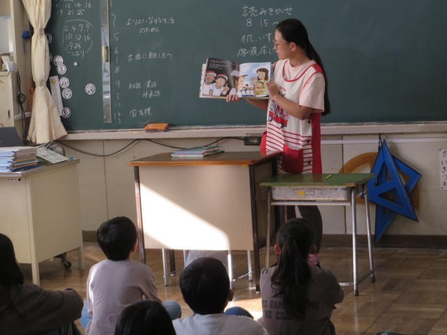 今朝は、5・6年生対象に読み聞かせがありました。高学年の子どもたちには、絵本や紙芝居はどんなものを読んだらよいだろう、と考えながら用意してくださいました。雰囲気や内容がぴったりで、児童は静かに聞き入っていました。読書の秋らしいひとときになりました。