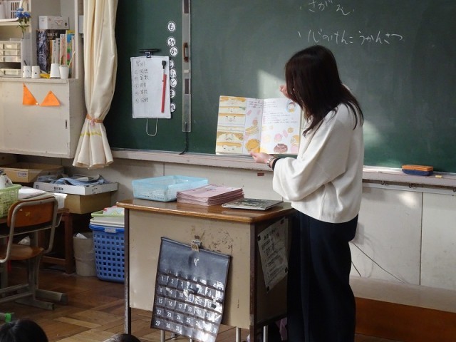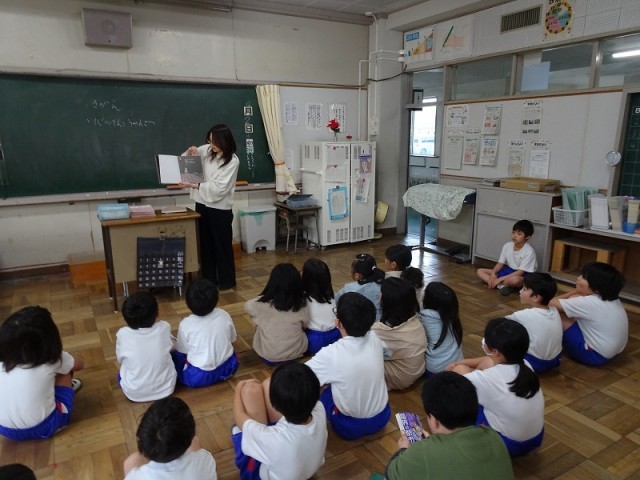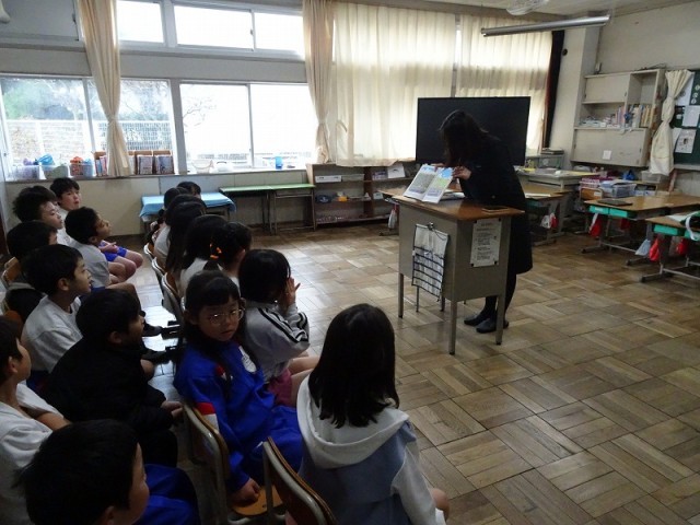 本日、2,3年生は読み聞かせをしていただきました。季節を感じられるものや、小さい時についついやっているものを題材にした物語に、子どもたちを熱心に聞き入っていました。