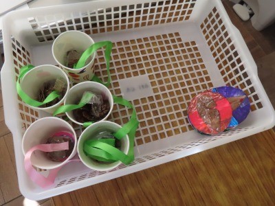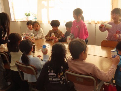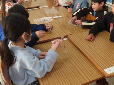 1年生の生活科の授業の様子です。「あきのおもちゃであそぼう」というめあてで、自分たちが作った、やじろべえやマラカス、けん玉、めんこでグループごとに交代で遊びました。マラカスは、紙コップに入れた木の実の種類や量によって、音が違うことに気づいた子どももいて、楽しそうでした。