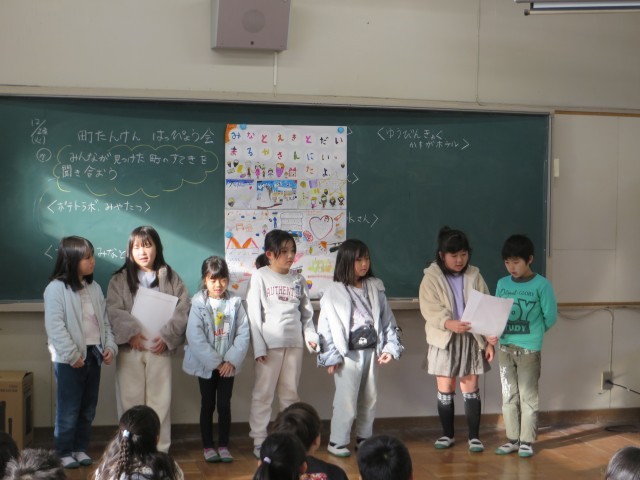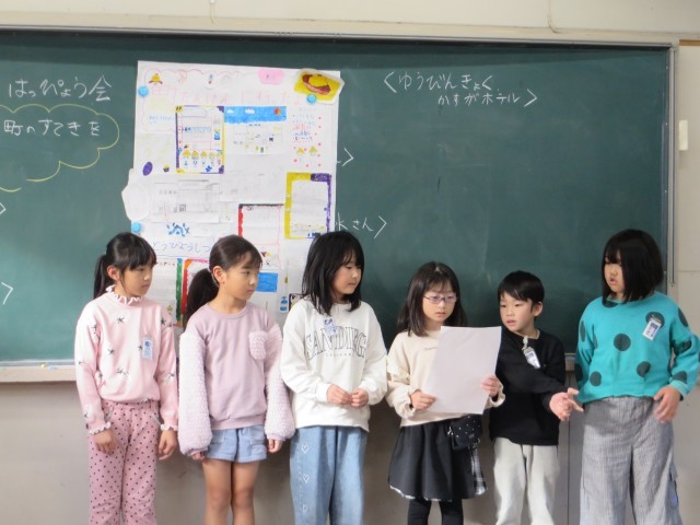 2年生が生活科室に集まり、町探検のまとめを発表会の形で行いました。お店の人との会話を紹介して、自分たちが知ったことをポスターにまとめていました。グループごとに伺ったお店や施設が違うので、発表を真剣に聞いたり感想を一生懸命書いたりする様子も見られました。