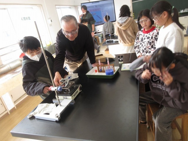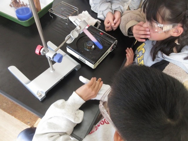 理科では、ゲストティーチャーの方に来ていただき、難しい実験を安全に行うことができるよう、みんなで協力して取り組んでいます。火を使ったり、熱した金属を使ったりなど、普段の生活と関わりはあるがはっきりと見ることができないような課題に取り組み、実験を楽しんでいます。