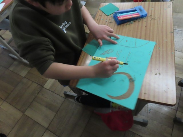 図工では、今年から彫刻刀を使った版画に取り組んでいます。今までの貼り版画ではなく、木版に思い思いの模様を彫刻刀でほる活動をしています。けがに気を付けつつ、楽しく彫り進んでいます。歓声が楽しみです。