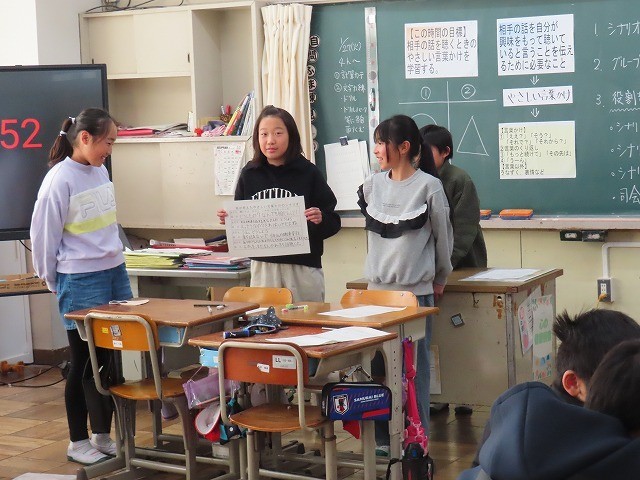 本日、5年生の学級活動でコミュニケーションスキルの向上を目指した授業を行いました。友達の話を聞くときに、「やさしい言葉かけ」ができるよう、班で演技をしながら学習しました。これからの学校生活にいかしていきましょう。