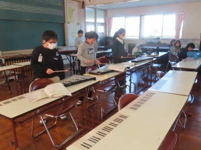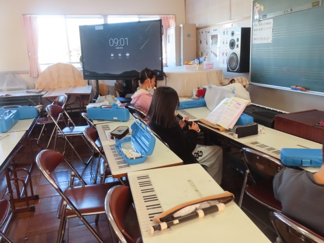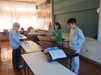 授業の様子(4年生) 公開日 2026/02/10 更新日 2026/02/10 4年生 4年生の音楽の授業の様子です。「豊かなひびきを味わいながら演奏しよう」というめあてで、「茶色の小びん」の曲を楽器に分かれて練習をしていました。それぞれの楽器のメロディを合わせたときの音の響きを楽しみました。 +1