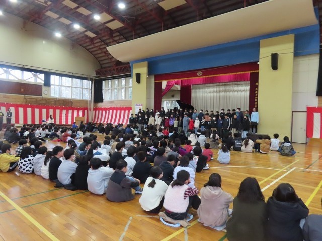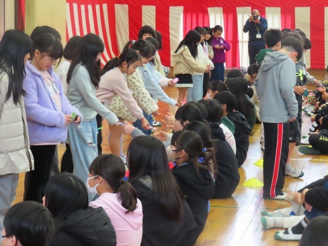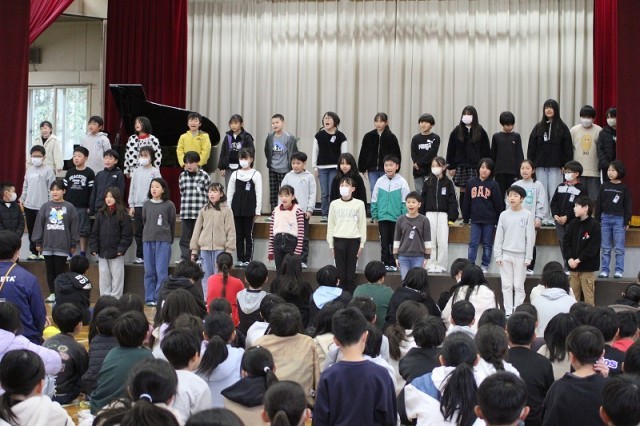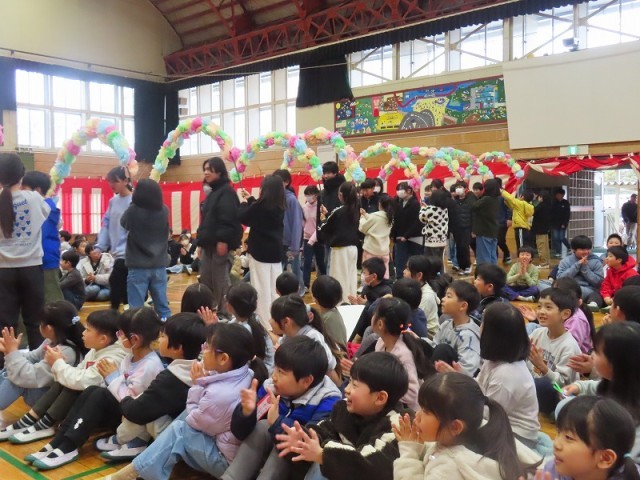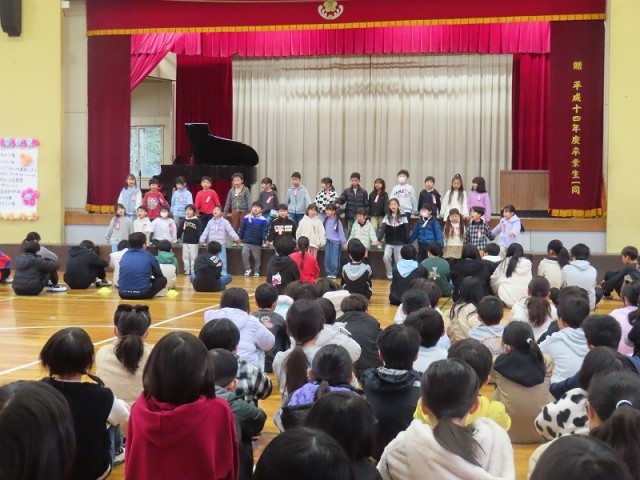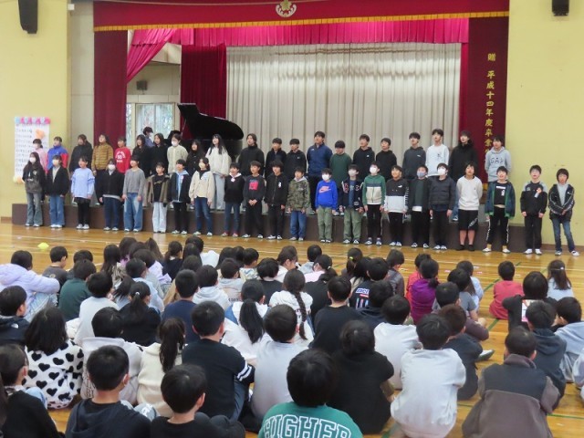 各学年から6年生へ向けて、感謝の言葉やクイズ、思いのつまった合唱などを披露しました。体育館は「ありがとう」という感謝の言葉であふれ、とてもあたたかい空気に包まれました。6年生からも、卒業式に向けて練習中のステキな合唱を聞かせてくれました。一生懸命に歌う6年生の姿は、在校生たちの心にしっかりと刻み込まれたことでしょう。会の最後に全員で歌った校歌は、今までで一番美しい響きでした。