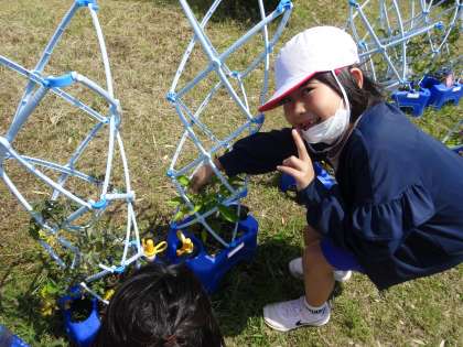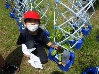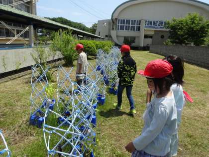 2年生が育てている野菜が大きくなってきました。花や実がたくさん見られるようになってきました。
