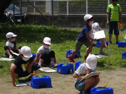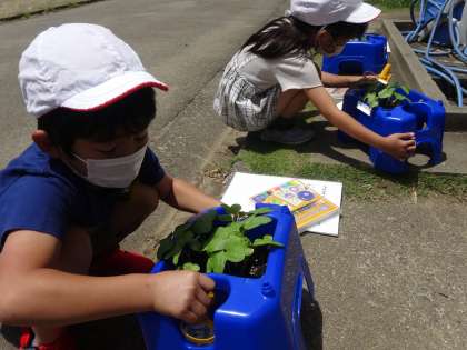 6月13日(月)、爽やかな晴天の下、1年生がアサガオの観察を行っていました。双葉がたくさん出ました。