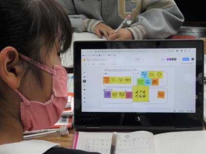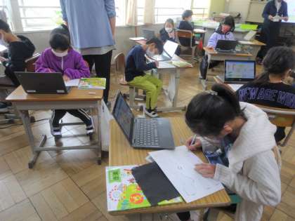 3年生は、音楽の学習で、プログラミングを活用して4小節のリズムをつくっていました。互いに聴き合い、良さを感じ取っていました。また、4年生は、社会の学習で、古くから残るものを受け継ぐために自分たちにできることを考えようということで、みんなで考えを出し合っていました。