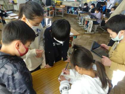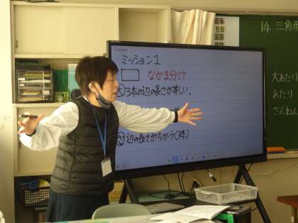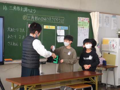 12月14日(水)、だんだん冬を感じる天気になってきました。今週は校内授業研究会を行っています。今日は3年1組の算数科の授業でした。くじ引きで出た三角形は大当たりなのか当たりなのか、そしてその秘密は何なのか、子どもたちは答えを導き出すことに夢中で取り組んでいました。何が同じで何が違うのか、その三角形の名前は何かなど、謎を解いていくように学んでいました。また、正三角形や二等辺三角形を正しく描くにはどうしたら良いか、みんなで勉強会をしていました。