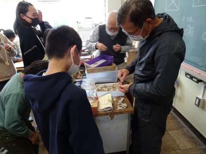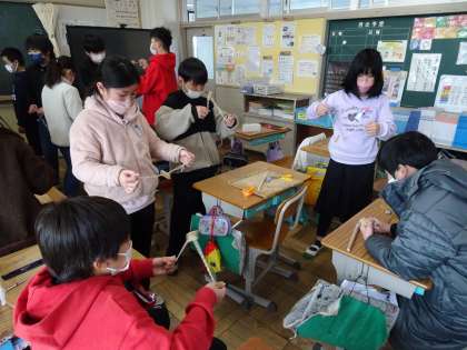 2月15日(水)、5年生の図画工作科の学習で、講師の方々にご指導いただきながら、竹を使って「ぶんぶんごま」作りを行いました。ひもをとおす位置をよく確かめながら、きりを使って慎重に穴を開けていました。できあがった「ぶんぶんごま」を試している様子も楽しそうでした。