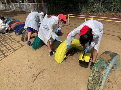 3月16日(木)、暑さを感じる晴天の下、日本住宅塗装協会の皆様にお力添えいただき、6年生が校庭のタイヤ119本と投てき板のペンキ塗りに挑戦しました。専門の方々にご指導いただき、ペンキを塗る楽しさを感じながら、子どもたちはカラフルなタイヤをどんどん仕上げていきました。あっという間に校庭が見違えるほど明るくなりました。また、最初は真剣に取り組んでいましたが、アイデアを活かしてオリジナルのタイヤに染めていく頃には、みんなの笑顔がはじけていました。