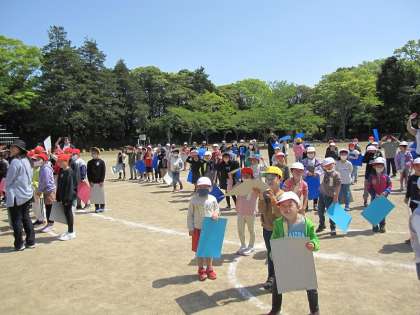 今日は、150周年記念事業の一つである、航空写真撮影を行いました。全校児童が運動場に並び、湊一小の校章を描きました。どんな写真が出来上がるか、楽しみです。大人になっても、今日のことを覚えていてほしいです。