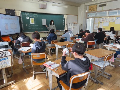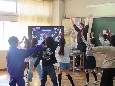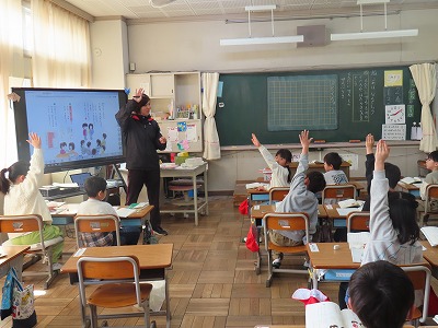 1年生は、国語で「これはなんでしょう」を学習していました。物の特徴を考えて、問題づくりをします。3年生は、6年生を送る会で「サクラサケサケ」のダンスの練習をしていました。5年生は、算数で、三角柱を作り、展開図の学習をしています。