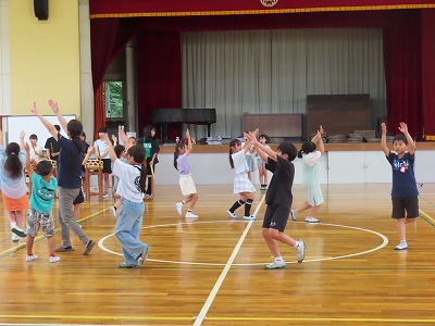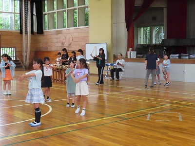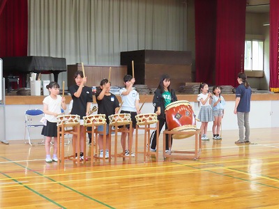 郷土芸能部活動 公開日 2024/06/14 更新日 2024/06/14 全体 郷土芸能部の活動が始まっています。祭りのお囃子のリズムに合わせて、踊りや歌、太鼓の練習を外部指導者の方に教わりながら、頑張っています。