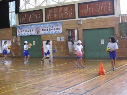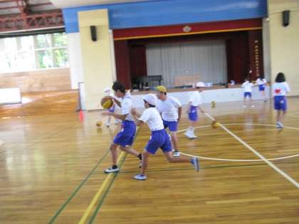 6年生の体育ではボール運動を行っています。今日はバスケットボールで、ドリブルや、相手にボールを取られないようにする練習を行いました。