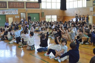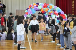 運営委員会の司会進行で、5年生の花のアーチの中、6年生と手をつなぎ1年生と入場しました。2年生からはアサガオの種を、3年生からは手作りメダルのプレゼントをもらった1年生。そして、4年生からのクイズを全校で行い、盛り上がりました。