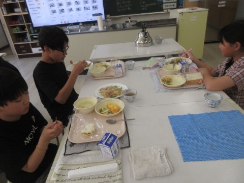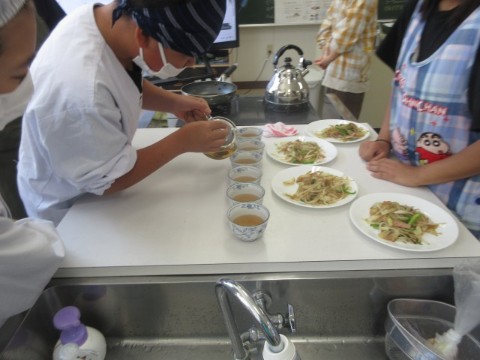 6月3日の6年2組の調理実習に引き続き、本日6年1組でも実習が行われました。お茶の入れ方を学び、作った野菜炒めと本日の給食をセットで食べました。調理から片付けまで手際よく作業できました。