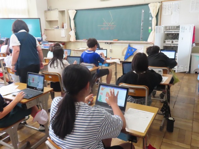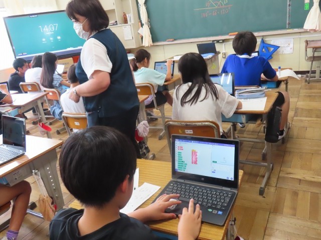 本日、5年生では、ICTサポーターの先生によるプログラミングの授業がありました。算数の図形を題材に、三角形や四角形、ひし形や平行四辺形をプログラムし作図することができました。